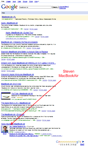 So what’s the point of the article? The first page is soaking with words “MacBook” and “MacBook Air”. Nice! Quite “incidentally” if you have your google settings set to English language you’ll see the link to the guy on the first page. Bottom of it, granted, but would you really expect him to beat Apple’s official page and Amazon?