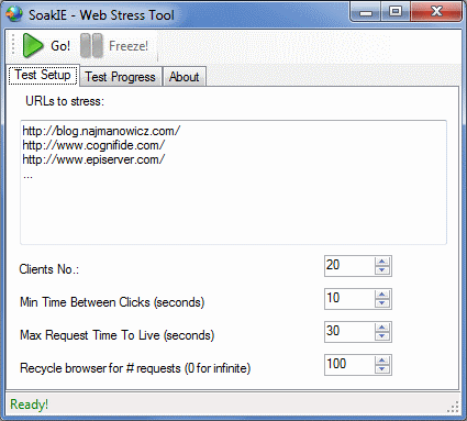 Naturally the application needs to know what to test. This is specified in the “Test setup" tab in the “URLs to stress:" text box. The URLs will be picked in a round-robin fashion. The first browser will get the first url, the next one will get the second and so on, if the list will get exhausted the browsers will get fed it from beginning. You can theoretically put them in the box with some other text (like pasting it from a Skype window without stripping the message decoration around them) – SoakIE should be smart enough to parse the text and get the URLs out of it.