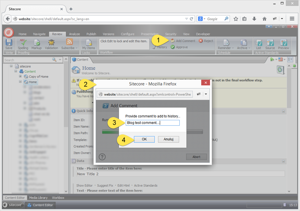Now let’s see how this behaves in action: Given I have my item in the Avaiting Approval state, when I click the Add Comment command (1) then I will see the PowerShell runtime popup (2) and ask me for the comment to be provided (3). When I provide the comment and click OK (4) the comment will be added.