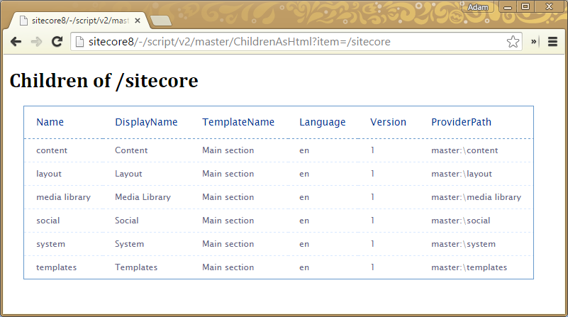 If you’re already working as a logged in user there is n need to provide credentials and you can work with all databases that are available to your user group, however if you’re not authorized you can place 2 additional parameters: user and password to provide the missing credentials. So the above URL can look as follows: http://hostname/-/script/v2/master/ChildrenAsJson?item=content&user=admin&password=b which will result in a request authenticated as the standard Sitecore admin.