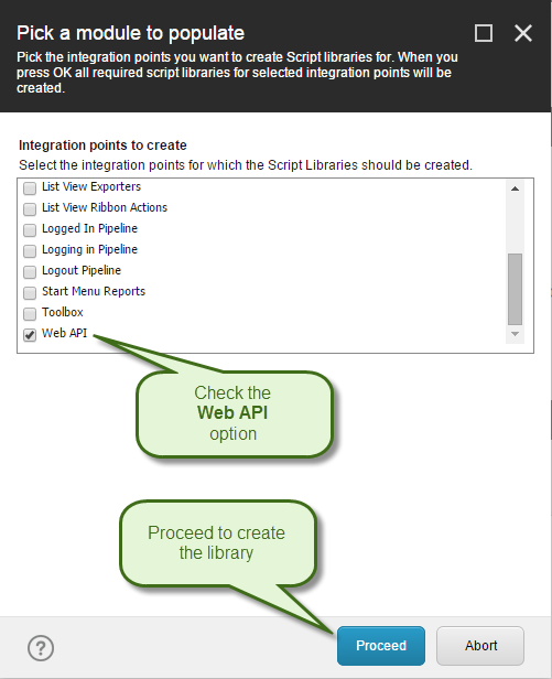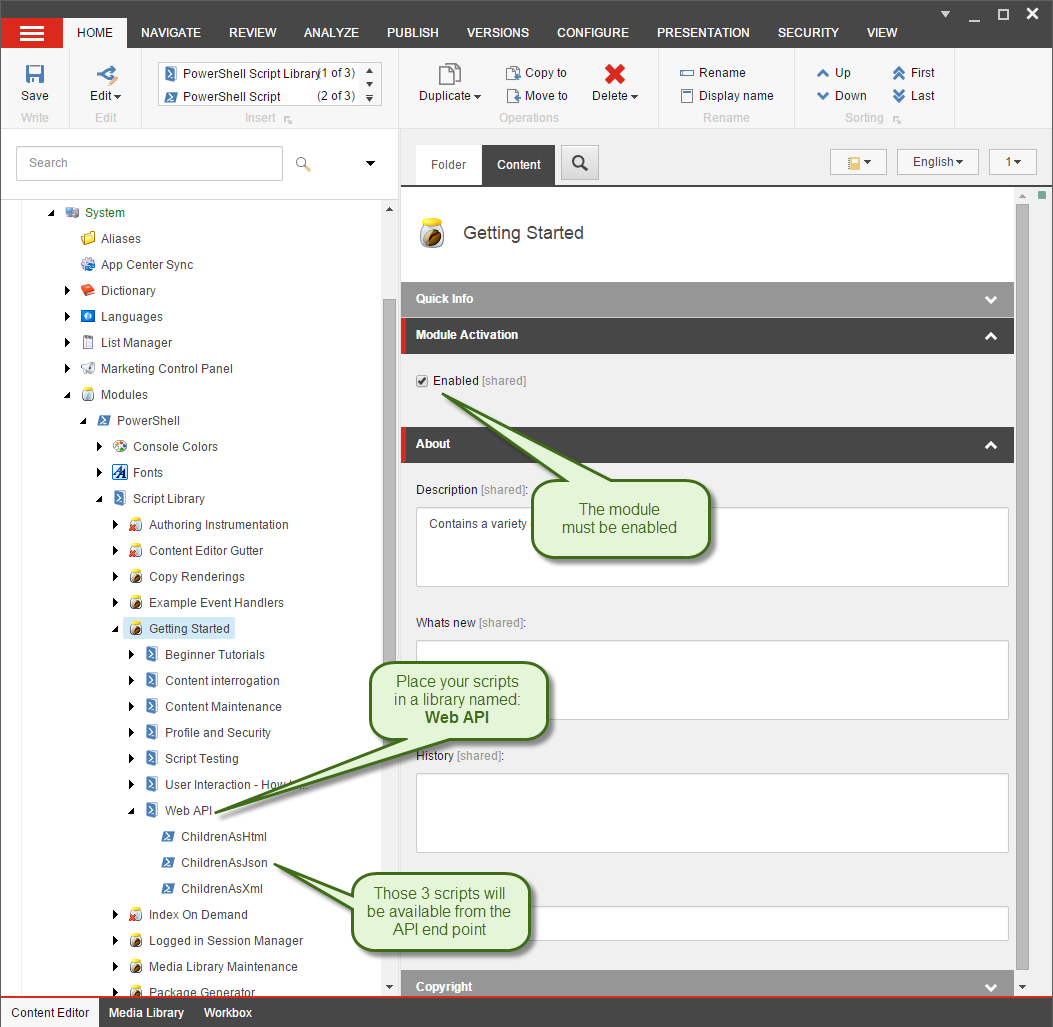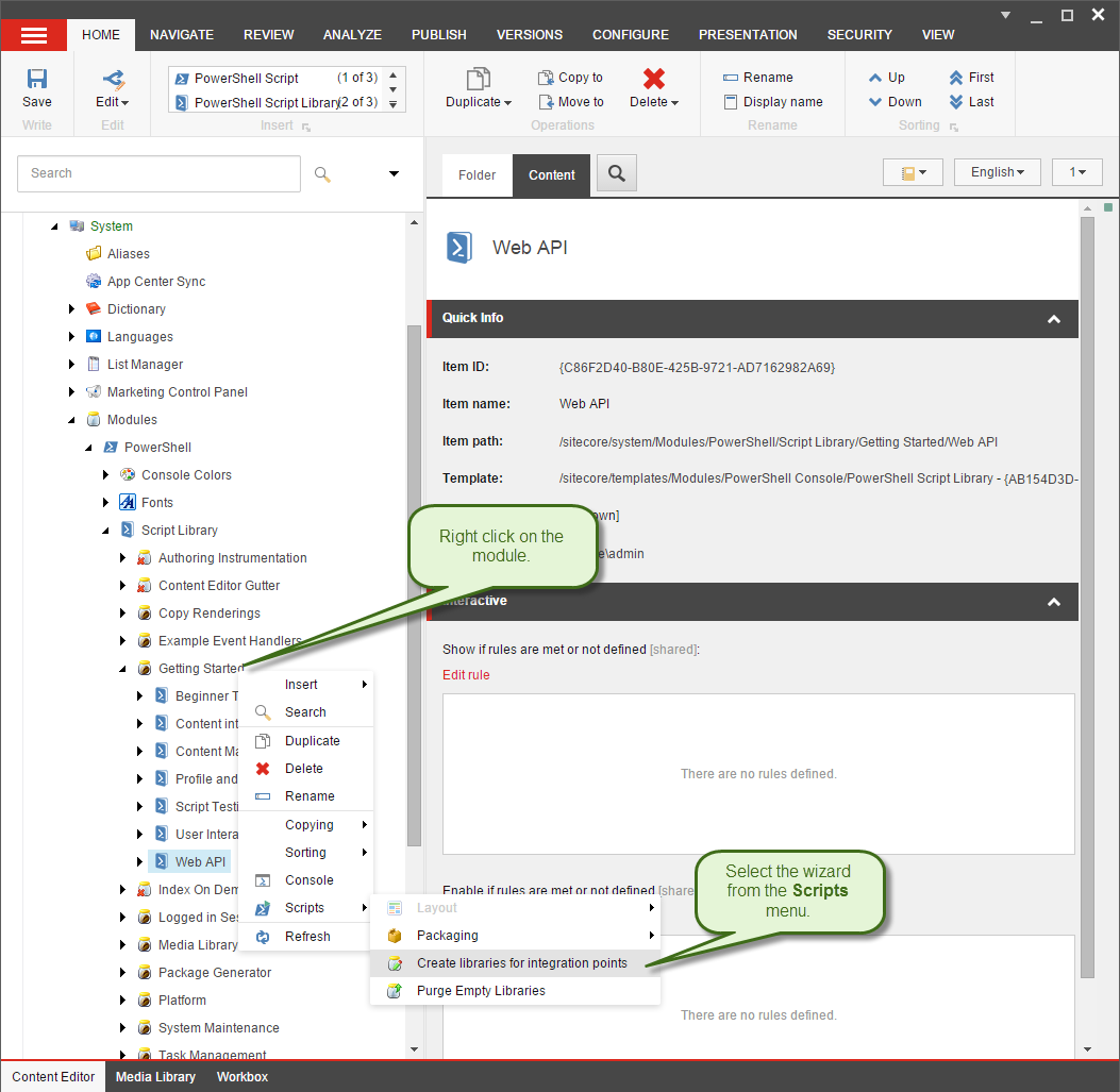 SPE will automatically make all the scripts available under this folder executable from its Web API service. If you don’t have the library in your module you can simply create a new Library named Web API or run the Create libraries for integration points wizard by right clicking the module in the Content Editor.